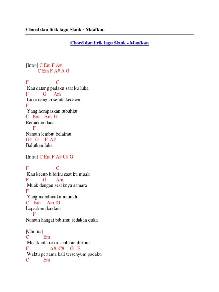 Video kali ini kita belajar lagu maafkan. F a# dm g f Inilah chord gitar lagu slank berjudul maafkan, lirik kau datang padaku saat ku luka, maafkanlah aku acuhkan dirimu, lengkap kunci gitar . Ini lagu hits banget sampe sekarang. Lirik dan chord slank, slank adalah sebuah grup musik di indonesia.